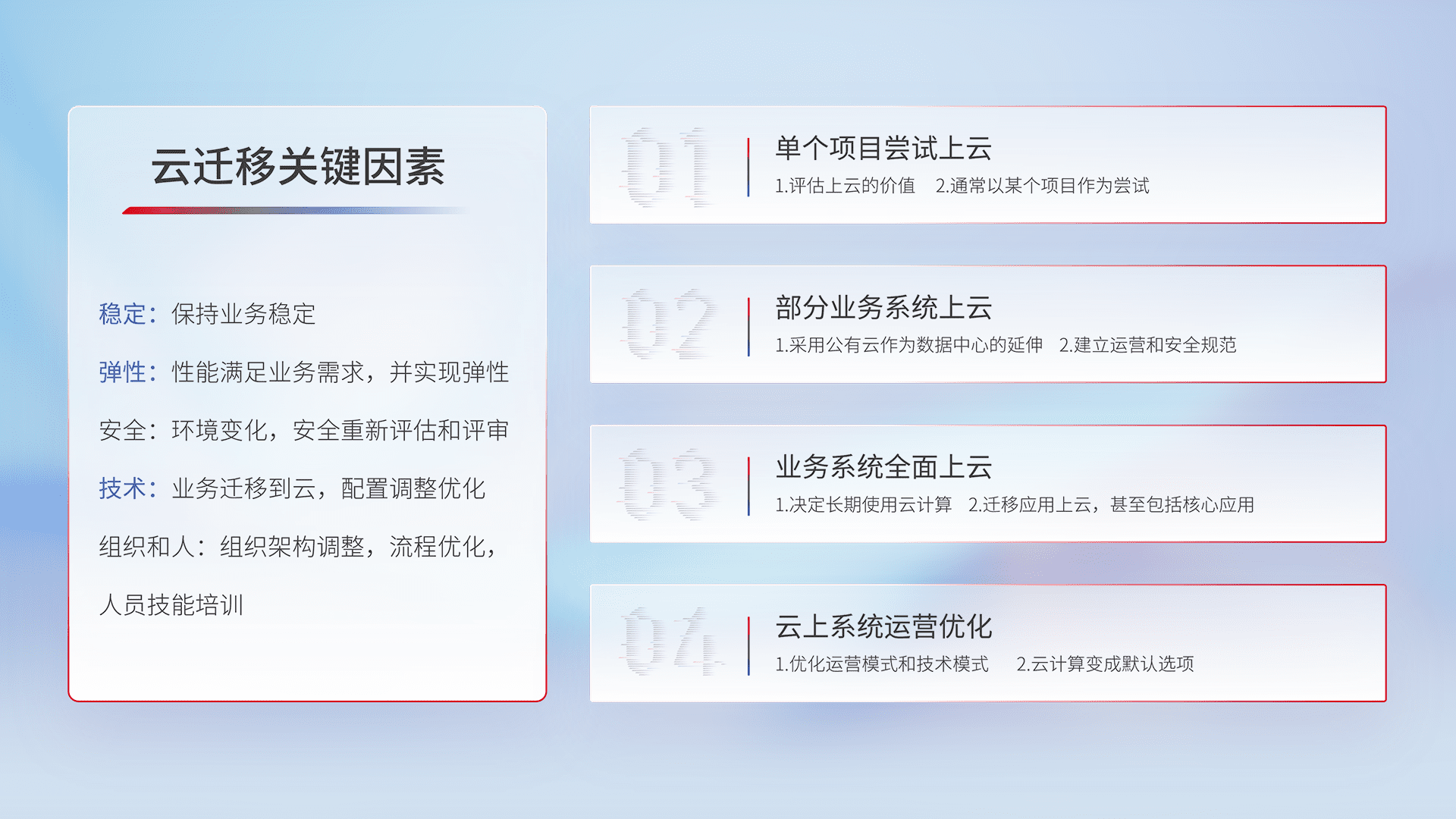 结合实际业务,,从规划设计、、云平台选型、、、、云原生改造、、、数据迁移、、、集成交付,,迁移全过程为客户识别最佳上云路径,,,,做好风险识别管理,,设计网络架构、、、身份权限、、、、安全审计合规、、操作审计、、日志审计、、监控告警策略、、多站点容灾设计等,,,,对云上基础设施进行整体规划,,,提升IT治理水平,,,以满足弹性、、、、高可用、、高性能的需求。。