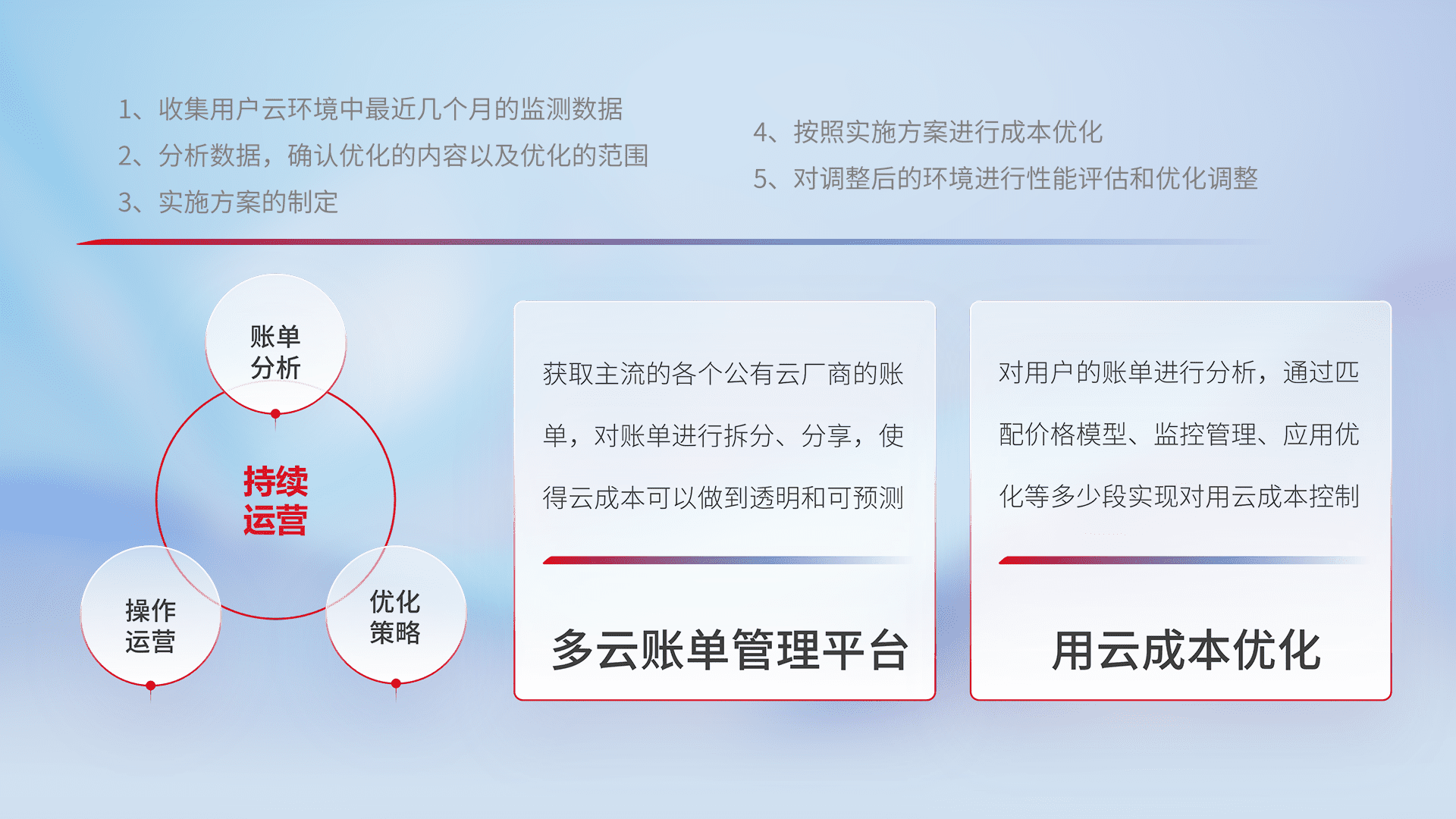 通过多云纳管,,,以统一的资源数据模型把客户的云资源进行抽象和封装,,进而实现对多云资源的统一操作,,,,保障云资源管理的可靠性、、、稳定性与可用性。。。量身定制化运维内容,,,,配置、、、开发运维、、、补丁管理、、、、备份、、、、监控、、、、认证和访问管理、、审计和日常巡检等,,,,保障在用云过程中的可靠度,,,稳定度以及高可用率。。
